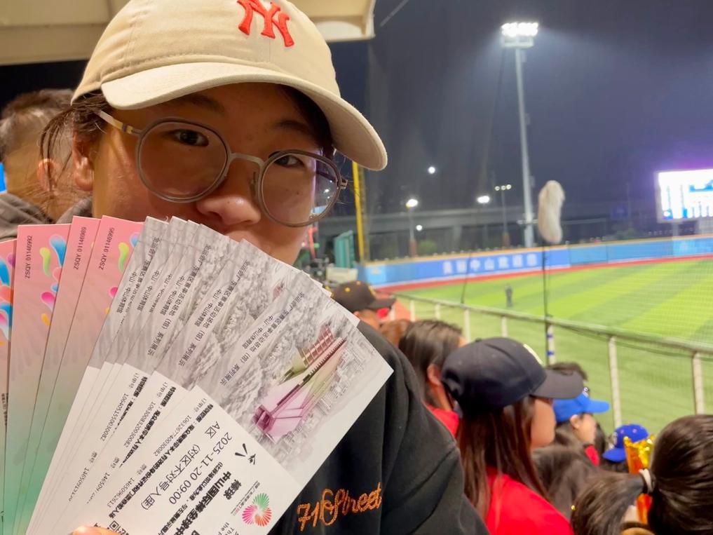 11月20日,一名观众在全运会棒球比赛中出示票根。图片提供:新华社记者霍思颖。